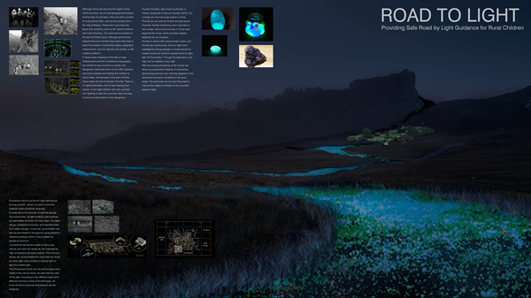 天津大学建筑学院参赛团队由罗宇涵、兰迪、刘媛、刘雨松四名学生组成,辛善超、孙德龙两位老师负责指导。他们的作品《向着光》聚焦于第三世界国家山区道路电力基础设施不完善等问题,为保障儿童上下学安全性,展开别出心裁的设计创意:用廉价、易得的萤石“铺设”一条“光之路”,萤石会在夜晚发出靓丽的色彩并持续数小时,营造了一段安全而富有趣味性的行程。