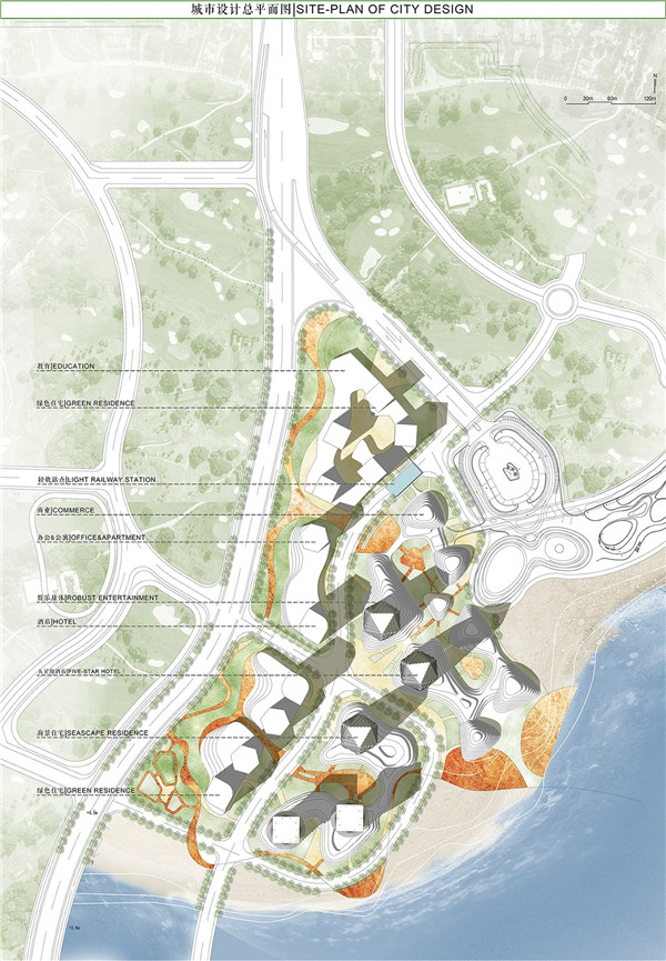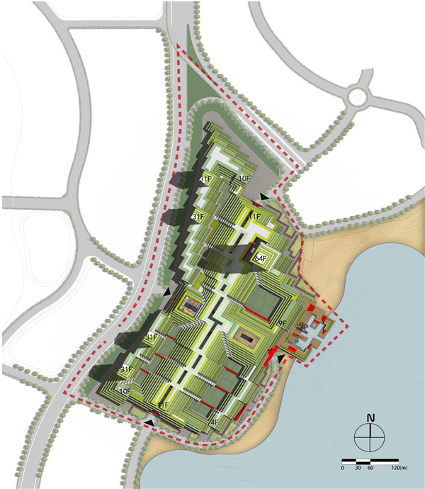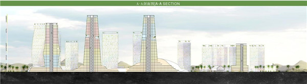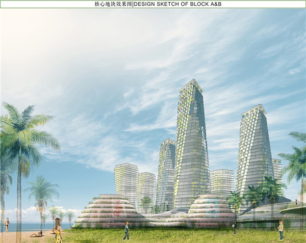 为了探索绿色健康的生活方式,我们在繁华的城市生活中引入城市绿丘的概念,将大海、天空、草地、绿树、建筑融为一体,使生活于其中的人们享受自然的馈赠。建筑作为生态系统的一部分,以山丘为基本形态,融入到地景之中,通过生态技术的应用实现立体绿化系统。