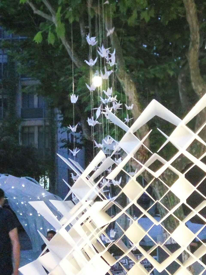 这一处洁净、空灵的空间,适合冥想,在其中静坐片刻,思绪也随翩飞的白羽飘向远方,似乎疲惫的心灵也得到了净化。为了更好地营造氛围,师生们还别出心裁地叠起了千纸鹤。完工后,建造作品与后方亭亭如盖的绿树,随风摇曳的纸鹤共同构成了现场一道美丽的风景线。夜幕降临后,精心布置的灯光更为作品增添了几分梦幻色彩。