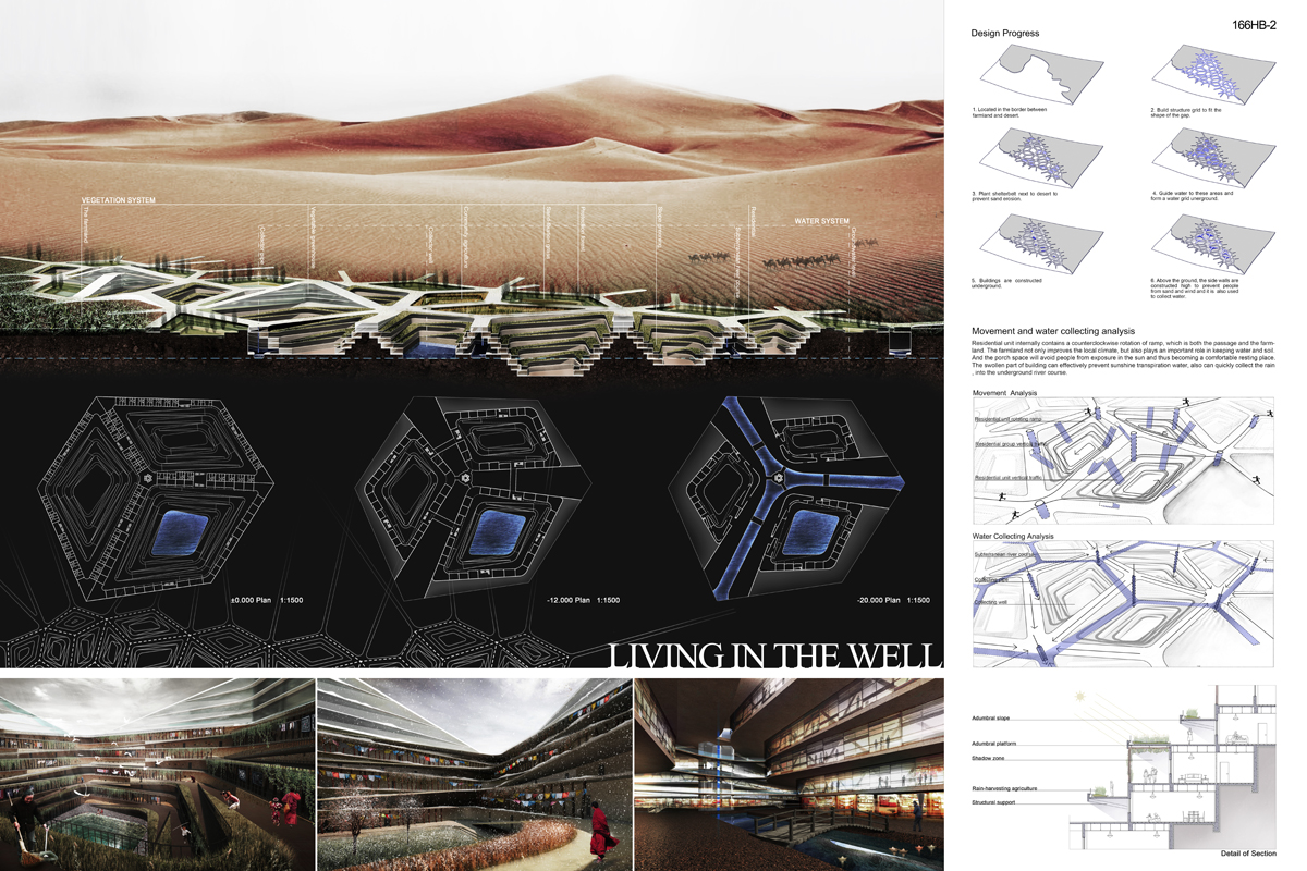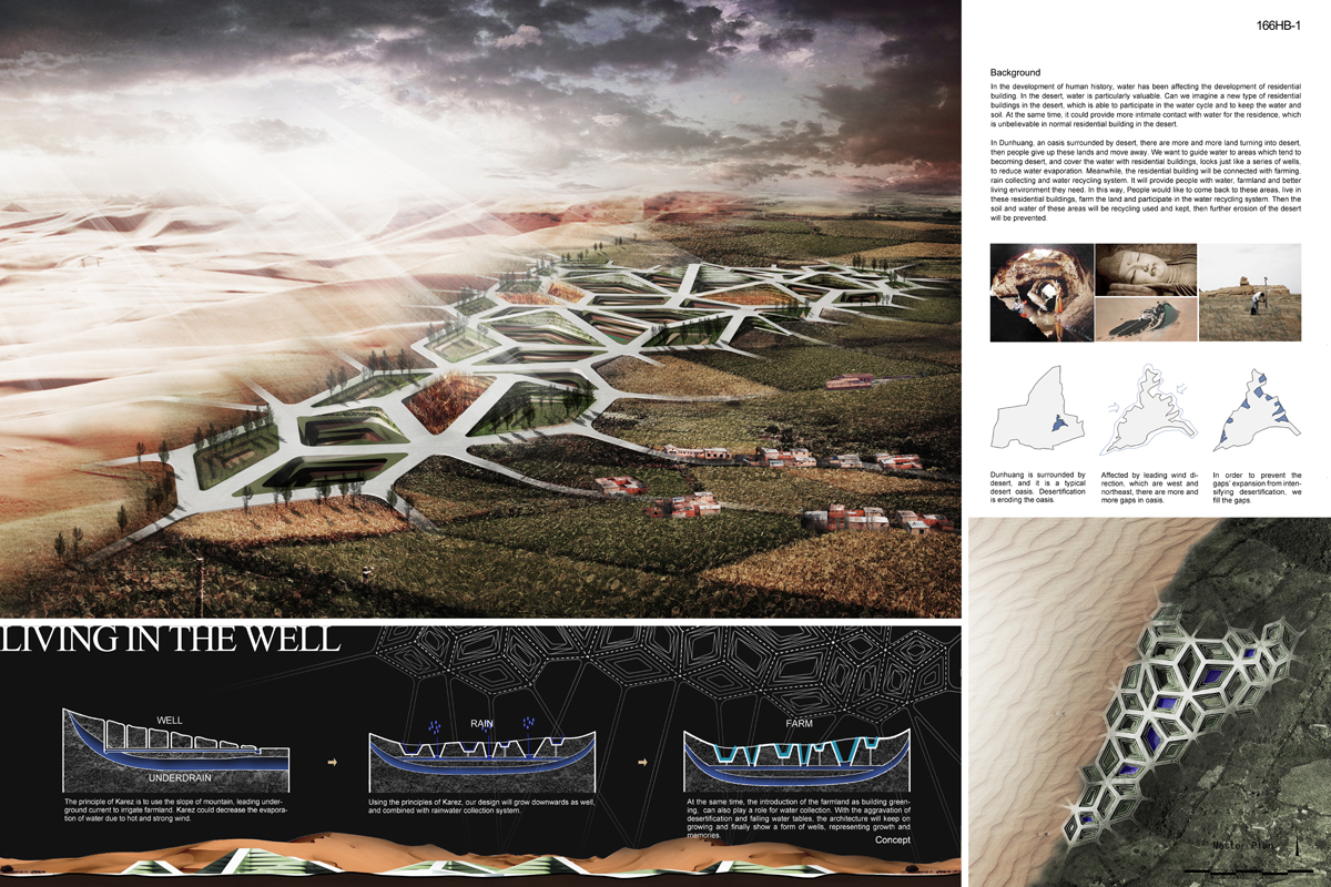 提名奖 井·城(Alternative Housing) 设计者:温亚、赵熠萌、钟山 指导教师:王志刚 设计者关注敦煌的沙漠化问题,沙漠的侵蚀迫使人们迁离栖息地。方案用井的形式将居住空间与水源紧密结合,创造性地重组人们逐水而居的生活模式。